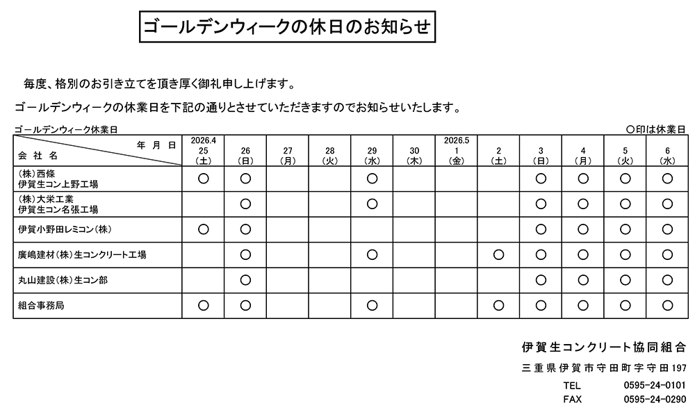 ゴ-ルデンウィ-クの休業日を下記の通りとさせていただきますのでお知らせいたします。